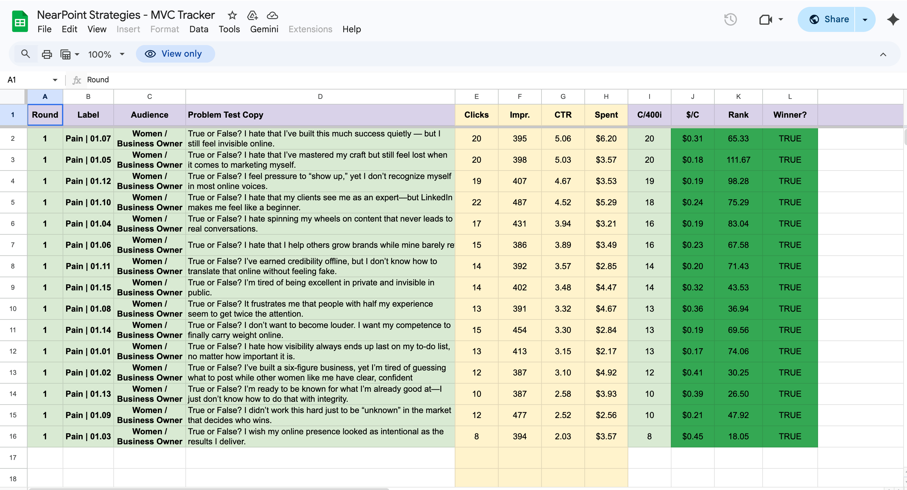 All 15 variants passed winner threshold (2%+ CTR, sub-$0.50 CPC)