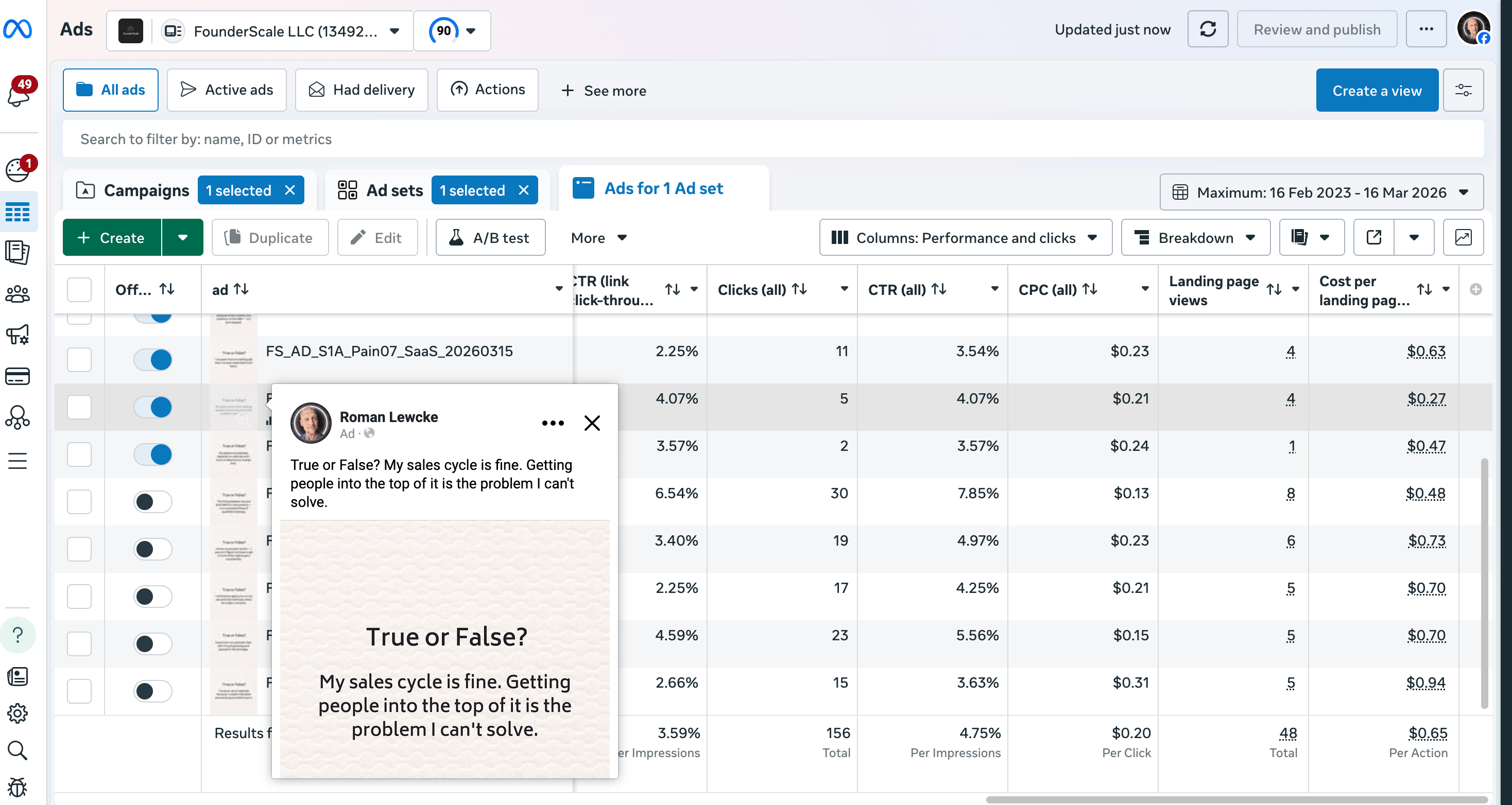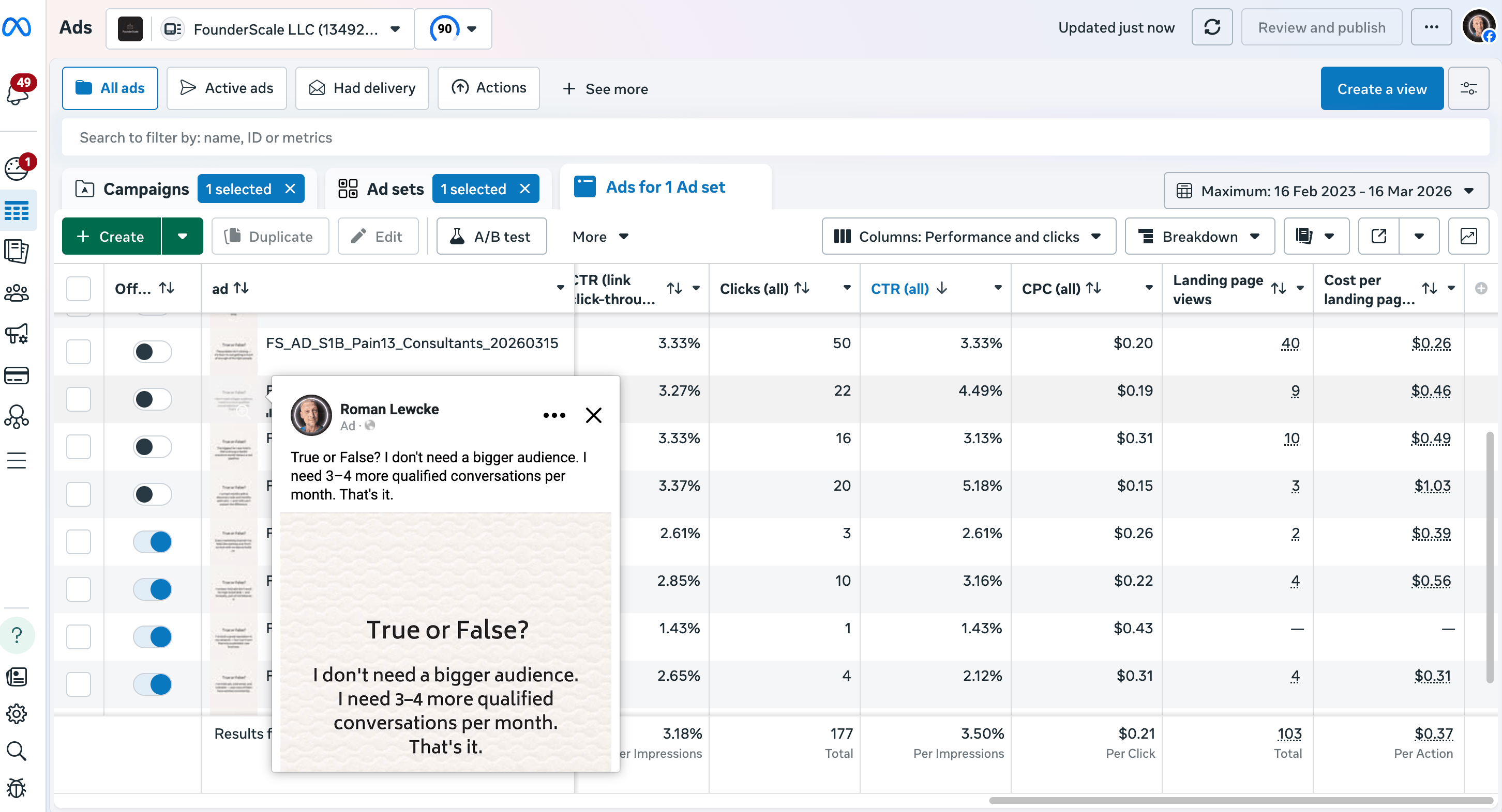 Then I ran the exact same 13 pain points against both audiences simultaneously. Two campaigns. Two ICPs. Same methodology. Meta distributed budget evenly across all variants and I set auto-pause rules at 370 impressions so no single ad could eat the budget.